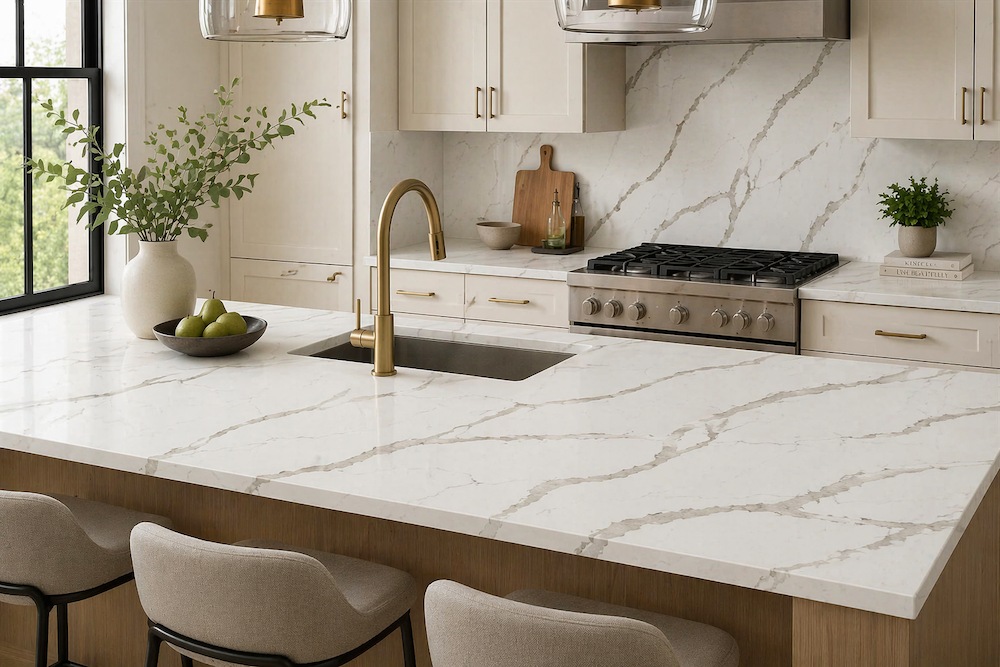luxurious surface inspired by the timeless elegance of Italian Calacatta marble, elevated with striking gold-accented veining Its crisp white backgrou